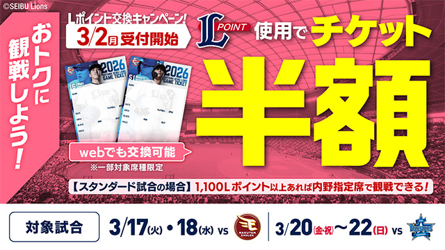 3/17(火)~3/18(水)の楽天戦は18時開始のナイター。平日なので仕事終わりにベルーナドームに向かう電車の中でチケットの購入ができちゃいます!