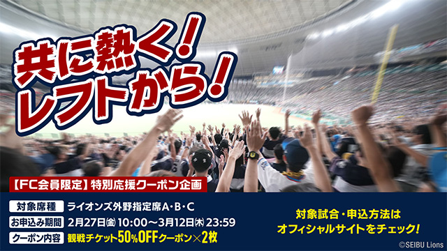 2/27(金)10:00~3/12(木)23:59までの間、ファンクラブ会員限定の観戦チケットの半額クーポン抽選企画が開催されます。