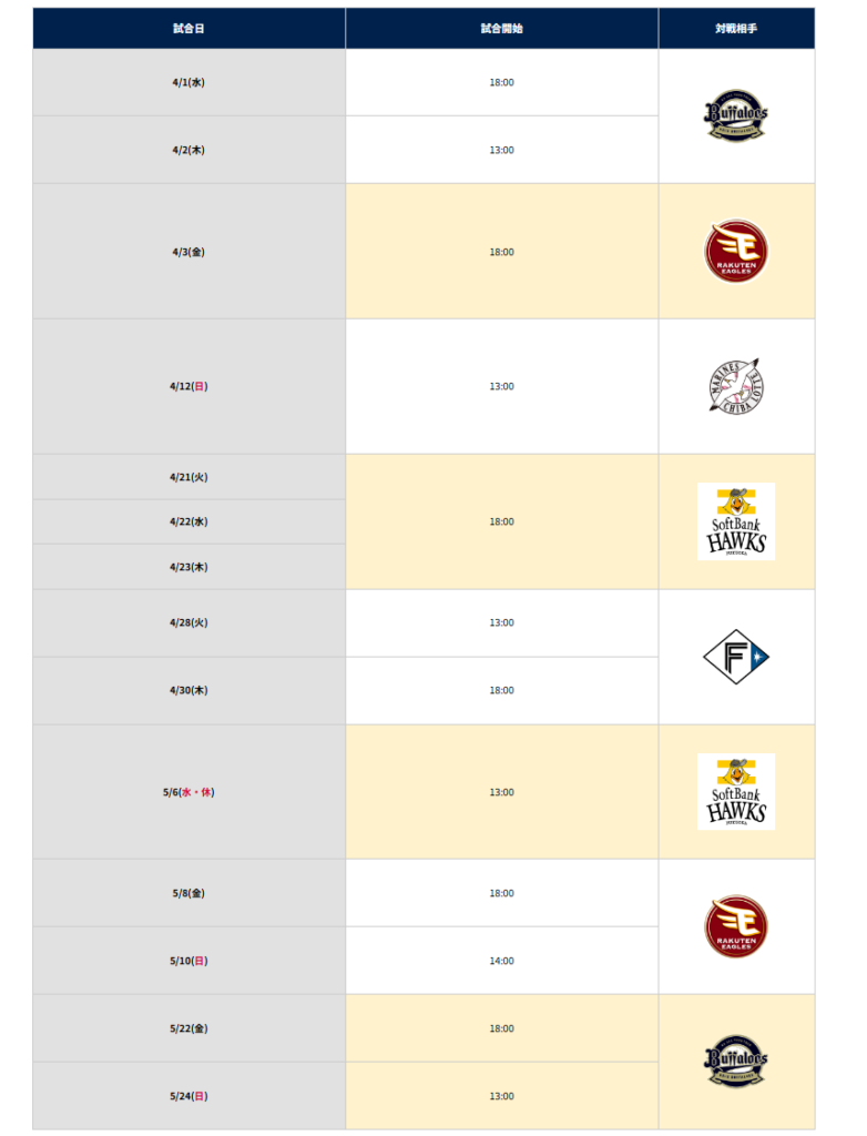 4月の試合で試合ランクがバリューまたはスタンダードの日は、4/1(水)~4/3(金)、4/21(火)~4/23(木)、4/28(火)、4/30(木)です。さらに5月の試合日程はベルーナドーム開催の平日は5/8(金)くらいです。5/29(金)も平日開催試合ですが、交流戦が始まっているので平日でも試合ランクが「プレミアム」に設定されていることが想定されます。