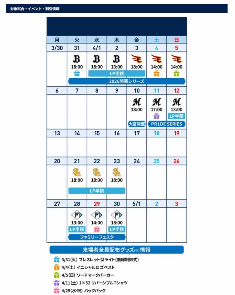 大人気のホーム開幕戦からGWに突入する4/30までの約1ヶ月分の試合が今回のエントリーの対象です。ホーム開幕戦は毎年満員御礼になりやすく、GWも配布グッズやイベント企画が豪華なので人気の日程です。