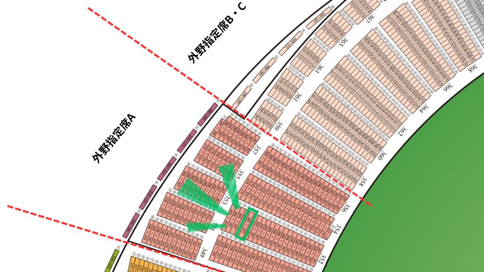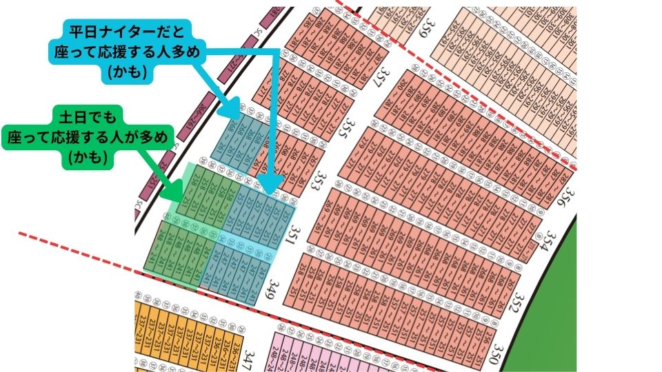 緑が土日でも座って応援する人が多い印象のエリア、水色(と緑)が平日ナイターだと座って応援する人が多い印象のエリアです。