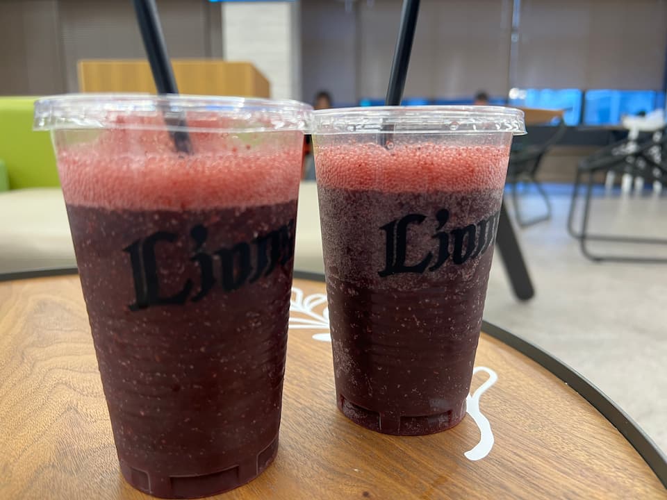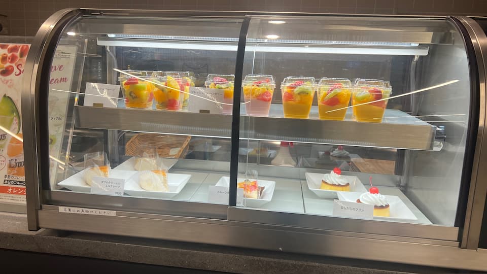 カフェコーナーでは、コーヒー、フレッシュジュース、なんとワインまで幅広いラインナップのドリンクメニューが用意されています。フルーツが添えられたソフトクリームや、夏季限定のかき氷も人気ですね。