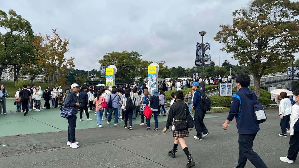 歩道橋に繋がるところまで並んでる…!正直ここまで人がいるとは思いませんでした。この日は練習公開の初日ではなく2日目でしたが、初日の土曜日が雨だったので、その分曇りだった2日目に人が流れたんですかね〜