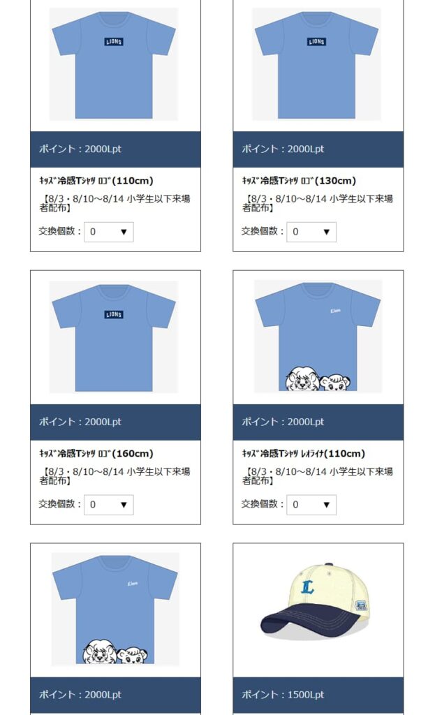 交換できるグッズは過去試合日に配布していたグッズが多いです。限定のTシャツやユニフォームなどが交換可能ですが、言ってしまえば「余りもの」を交換できるという印象です。