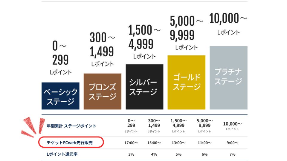 Lポイントのステージランクの影響はポイントの還元率だけにとどまりません。ファンクラブ会員特権のチケット先行販売の順番がLポイントのステージランクで決まってしまいます。